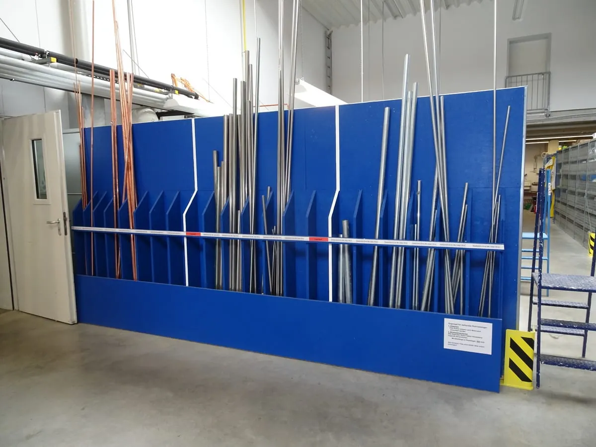 - Vorne ist immer nur eine Sorte sichtbar und beschriftet, der Ersatz steht dahinter. Daneben lagert das nächste Material.