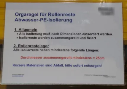 - Es ist zu beachten, dass Standardmaterial keinen Entsorgungszeitpunkt hat, da es kontinuierlich verbraucht wird. Erst, wenn es zu kurz oder zu klein und deshalb unbrauchbar ist, wird es entsorgt. Dafu¨r sollte jeder Betrieb eine Restedefinition u¨ber Maßvorgaben haben, z. B. „Rohrreste unter einem Meter sind Abfall, bitte sofort entsorgen.“