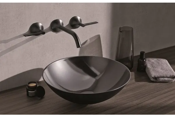 Schalenbecken SB.K360.GS mit der neuen Oberfläche Metallic Dark Iron. Die metallisch glänzende Oberfläche changiert je nach Geometrie und Blickwinkel in Nuancen.