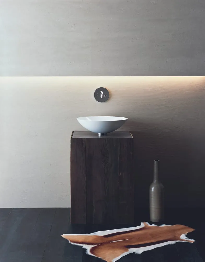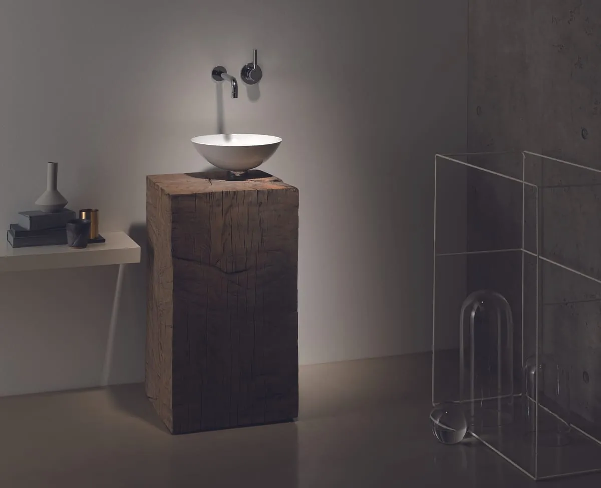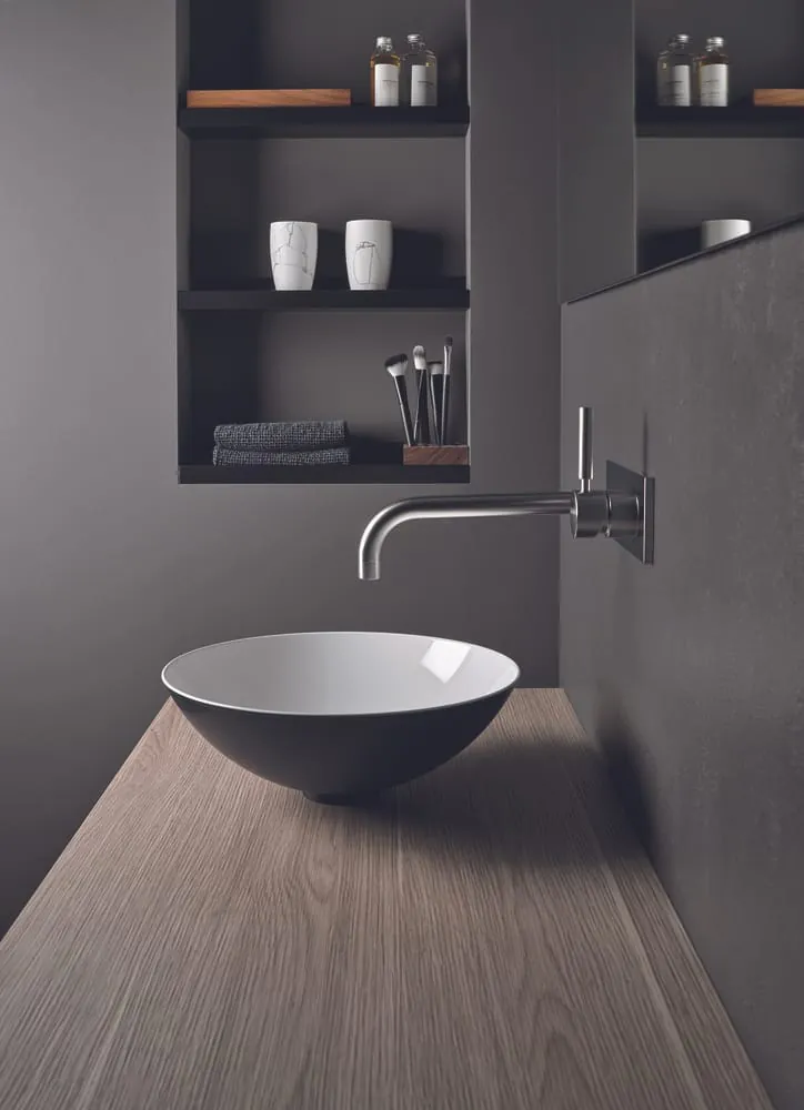 Je nach persönlichem Stil lässt sich mit A?system init eine vielfältige Auswahl an Becken aus glasiertem Stahl sowie Trägerplatten und Möbel in unterschiedlichen Maßen, Materialien und Oberflächen zu einer ästhetischen Gesamtkomposition vereinen.