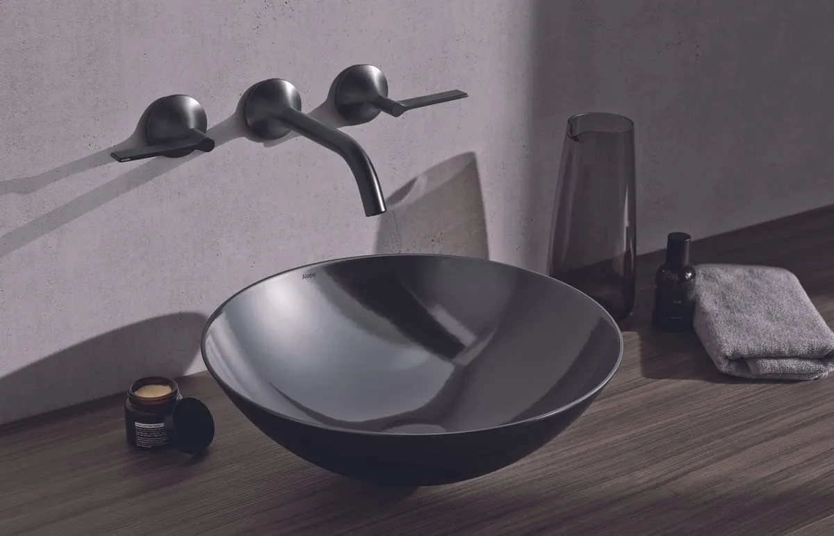 Das Schalenbecken mit der neuen Oberflächen „Metallic Dark Iron“. Die metallisch glänzende Oberfläche changiert je nach Geometrie und Blickwinkel in Nuancen. Jede Lichtsituation verleiht dem Waschbecken einen ganz eigenen Charakter. – © Alape