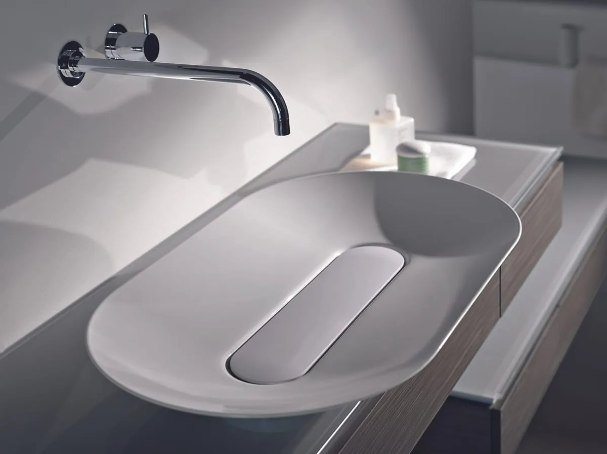 „Zu dieser Zeit war der Markt bestimmt durch Unterbaubecken und Einbaubecken. Die Trägerplatte und der Gesamteindruck des Waschplatzes standen als eine Einheit im Mittelpunkt. Anderes ergibt sich für das Schalenbecken, das sich deutlich abhebt und in den Mittelpunkt des Betrachters rückt. Auch weitere Parameter galt es zu berücksichtigen: Um die genormte Waschplatzhöhe von 90 cm, sprich die Höhe, in der Hände üblich gewaschen werden, beizubehalten, musste die Trägerplatte um die Höhe des Schalenbeckens nach unten gesetzt werden. Es ergab sich also ein völlig neues Erscheinungsbild: Plötzlich waren Becken, Waschtischplatte und Unterschrank nicht mehr auf einer Höhe“, erläutert Jürgen Kloss.