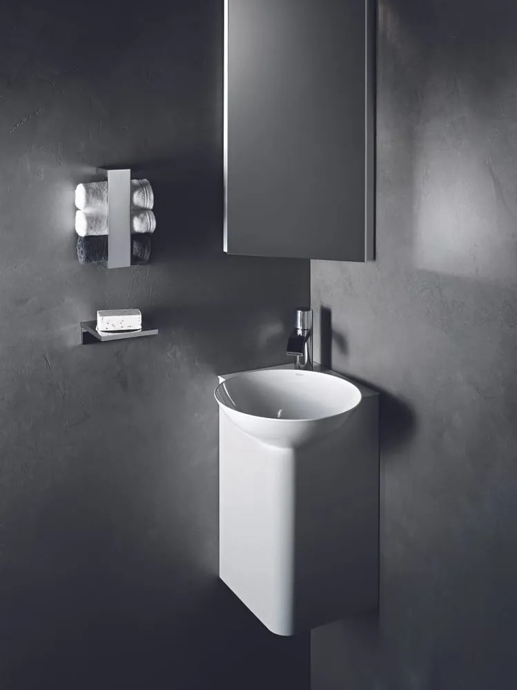Das Schalenbecken diente als Grundlage für viele weitere Entwürfe, die Alape in den Markt gebracht hat und wird bis heute in verschiedenen Durchmessern produziert. Dazu zählen auch die Lösungen für Kleinst- und Gästebäder, wie Piccolo und Insert, die in Kombination mit Handtuchhaltern und Ablageflächen ganze Waschplätze darstellen.