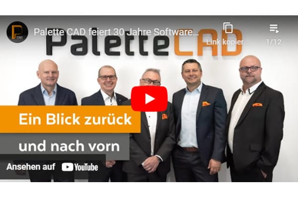 Anlässlich 30 Jahren Palette CAD bedankt sich der Softwareanbieter bei allen Kunden, Partnern und Mitarbeitern für ihr Vertrauen und ihre Unterstützung. Einen Einblick in die Erfolgsgeschichte von Palette CAD gibt es mit einem kurzen Video unter www.palettecad.com/30-jahre. Darin kommen Firmengründer Walter Zinser und die Vorstandsmitglieder Volker Zeller, Dirk Böckstiegel, Elvis Grabić und Frank Kobs zu Wort.