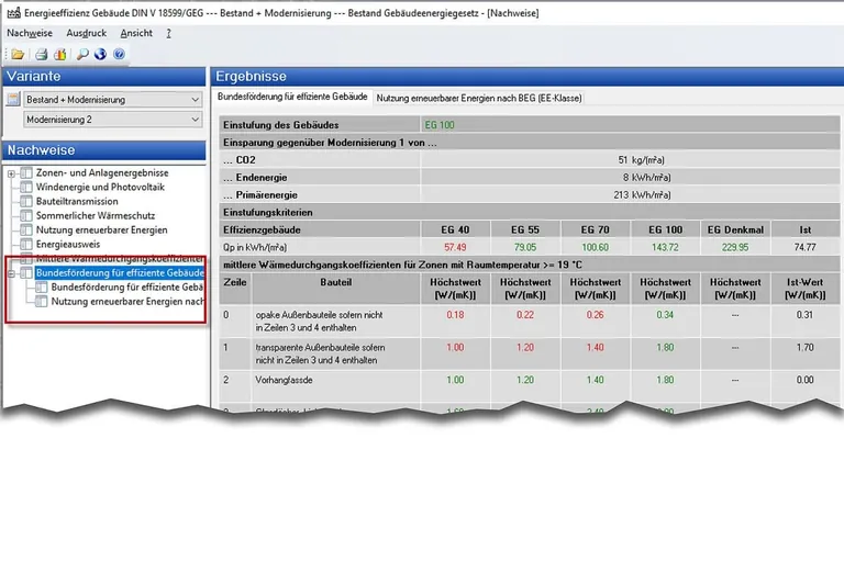 Die Bundesförderung gilt für Neubauten ebenso wie für Bestandsbauten. In jedem Fall muss die BEG-Effizienzgebäude-Stufe anhand bestimmter Parameter nachgewiesen werden; im Sanierungsfall entweder durch Nachweis eines „Schritt für Schritt“-Konzeptes mit Maßnahmen, die über einen längeren Zeitraum abgestimmt sein müssen, oder eines Konzepts „Sanierung in einem Zug“. NGF-abhängig beträgt die Förderhöhe bis zu 80 % des förderfähigen Beratungs-Honorars, maximal jedoch 8.000 Euro. Die benötigten Nachweise lassen sich mit dem an die Bundesförderung angepassten Modul „Energiebericht“ des Solar-Computer-Berechnungsprogramms „Energieeffizienz Gebäude DIN V 18599 / GEG“ führen und dokumentieren.