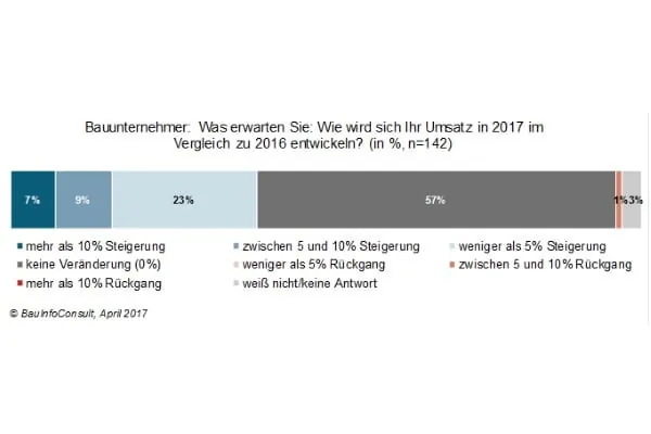 In telefonischen Interviews wurden im Frühjahr 142 Bauunternehmer nach ihren Umsatzerwartungen für 2017 befragt. Mit 39 % geht deutlich mehr als jeder dritte befragte Bauunternehmer davon aus 2017 mehr Umsatz erzielen zu können als 2016. Über die Hälfte (57 %) sind sich sicher, dass ihr Umsatz gleich hoch wie im Vorjahr ausfallen wird.