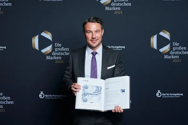 „Große deutsche Marken“: Der Sauerländer Armaturenspezialist Kludi ist Teil der Leistungsschau der deutschen Industrie, die der Rat für Formgebung seit 2013 alljährlich ein einem Kompendium versammelt. Den Jahresband 2021 nahm Sebastian Biener, Sprecher der deutschen Vertriebsgeschäftsleitung, für Kludi bei einer Gala in Berlin entgegen. – © Rat für Formgebung