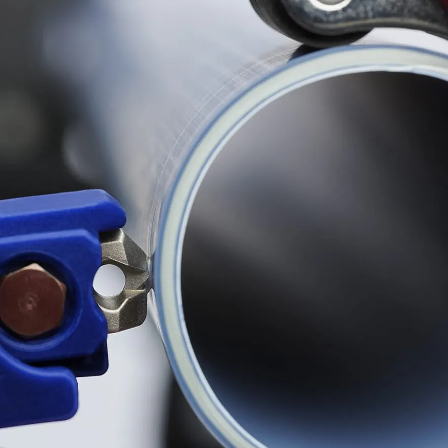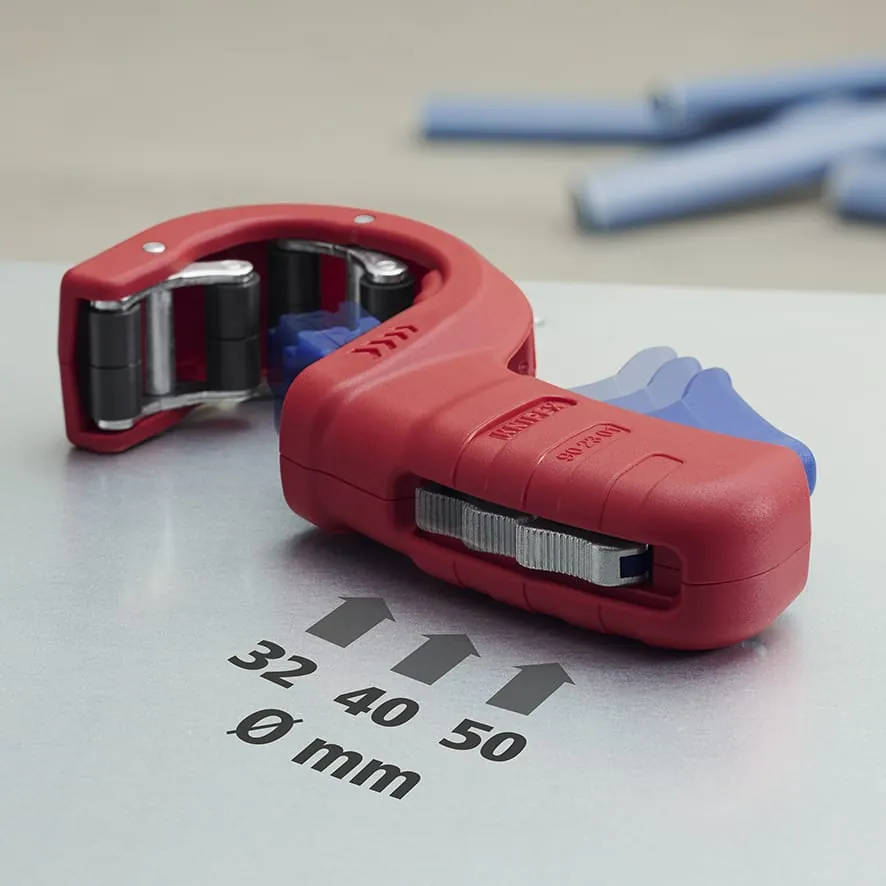 Der neue Knipex DP50 Rohrabschneider trennt Kunststoffrohre mit einem Durchmesser von 32, 40 oder 50 Millimeter und Wandstärken bis 2,4 Millimeter zuverlässig, leicht und sauber. Mit einem Schieberegler aus robustem Metall lässt sich das Werkzeug auf die drei gängigen Durchmesser für Hausabwasserrohre präzise einstellen. Besonders komfortabel: Eine zweistufige Klinge trennt das Werkstück und bringt im gleichen Arbeitsschritt die Fase für ein fachgerechtes Zusammenfügen der Rohre an.