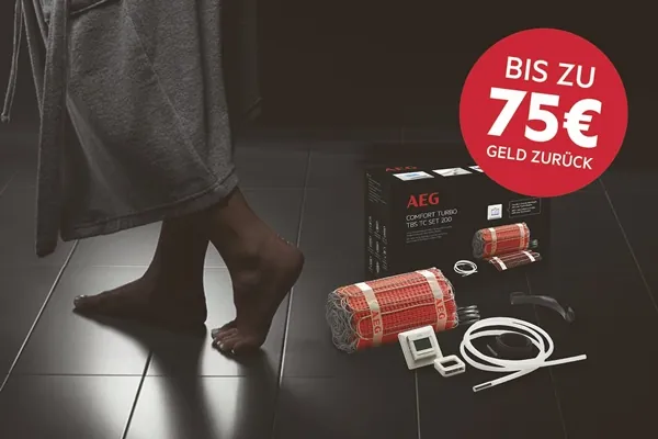 Aufgrund der hohen Heizleistung von 200 W/m² temperiert das elektrische AEG Heizmattensystem Comfort Turbo dicke Fliesen und Natursteinböden optimal. Mit der großen Sommer-Cashback-Aktion 2018 gewährt AEG Haustechnik noch bis 30. September 2018 eine Geld-zurück-Garantie der erfreulichen Art: Privaten Endkunden winkt für alle Thermo Boden Comfort Turbo-Sets eine attraktive Rückvergütung: Pro Set gibt es bis zu 75 Euro zurück. Die Aktions-Sets sind über die AEG Partner aus Fachhandwerk und -handel erhältlich.
