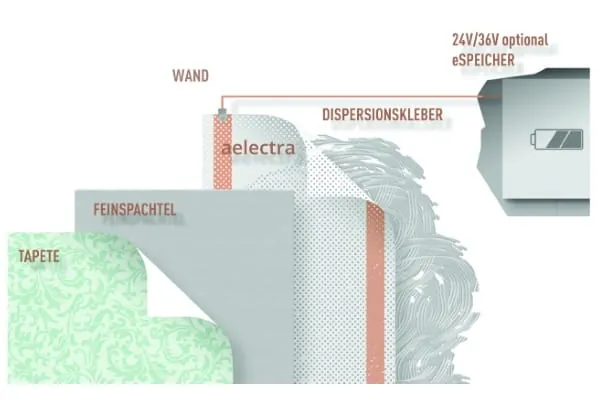 Aelectra ist eine perforierte Heizfolie aus Kunststoff und Carbon, die unsichtbar in Fußboden, Wand oder Decke installiert und mit Niedrigspannung versorgt wird. Die Folie erwärmt sich innerhalb einer Minute auf max. 33° Celsius und beheizt alle Räume bis zur gewünschten Temperatur. In Verbindung mit dem Stromspeicher aelectra+ und bei Nutzung von erneuerbarem Strom aus Wind oder Solar lässt sich die Flächenheizung zu 100 % mit Ökostrom betreiben. Damit ist Aelectra nicht nur besonders günstig im Betrieb, sondern auch vollkommen emissionsfrei.