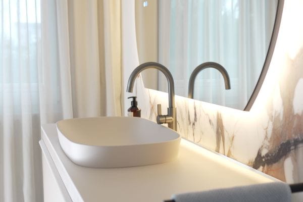 Kernstück der Umsetzung: das RenoDeco Wandverkleidungssystem von HSK. Die eleganten Aluminiumverbundplatten wurden direkt auf dem alten Fliesenspiegel angebracht. Das spart Schmutz, Lärm und Zeit – ideal für Sanierungen im Bestand. Die Wahl fiel auf die Dekore Arctic-Weiß kombiniert mit dem Individual-Dekor Adrina-Statuario, einer modernen Marmoroptik mit seidenmatter Oberfläche. Die hinter den Platten verborgenen Plattenstoßprofile ermöglichten es, die Platten Stoß auf Stoß profillos und fast fugenlos miteinander zu verbinden. Die alten, kleinteiligen Fliesen mit teilweise rissigen Fugen wurden durch 150 x 255 cm große Platten ersetzt, sodass die Wand wie aus einem Guss erscheint. Die Wandverkleidung ist aber nicht nur optisch ein Highlight, sondern bietet vor allem innerhalb der Duschkabine einen praktischen Mehrwert: Kalk, Schmutz und Seifenreste haften kaum noch an der Wand, da das Wasser dank des Lotus-Effekts einfach abperlt – das macht die Reinigung deutlich einfacher.