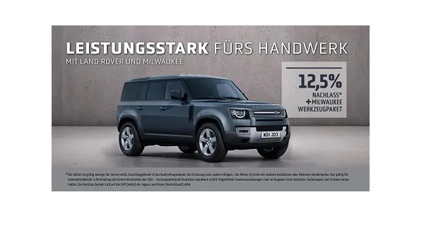 Die Aktion „Leistungsstark fürs Handwerk“ verspricht bis Ende Juli 2021 gewerblich tätigen Handwerkerinnen und Handwerkern attraktive Nachlässe beim Neuwagenerwerb mit einem Berechtigungsschein der SDH, nämlich 10 % auf den Land Rover Defender und sogar 12,5 % auf den Land Rover Defender Hard Top. Ein Werkzeugpaket von Milwaukee im Wert von 2.022 Euro netto UVP gibt es als Gratis-Zugabe dazu.