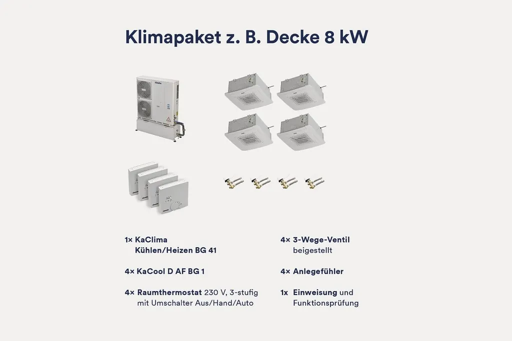 Für einen leichten Einstieg in den Bereich Kühlung bietet Kampmann jetzt verschiedene Klimapakete zu Festpreisen an. Diese enthalten einen Kaltwassererzeuger der Serie KaClima mit dem Kältemittel R32, passende Fan Coils als Deckenkassette KaCool D AF und Wandgerät KaCool W sowie die nötigen Raumthermostate und Ventile.