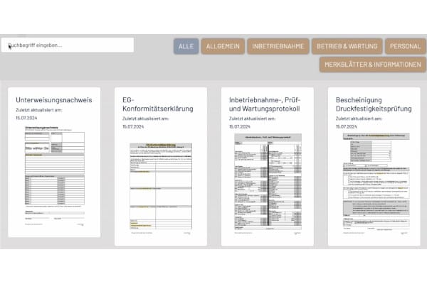 Diese Sammlung an Dokumenten erleichtert es den Fachbetrieben, die gesetzlich und technisch erforderlichen Schritte systematisch und effizient zu dokumentieren. Die dazu zur Verfügung gestellten Formulare, Protokolle und Checklisten können User direkt über jeden Webbrowser mit allen gängigen Endgeräten ausfüllen. Weiterhin können sie individualisiert mit dem eigenen Firmenlogo im PDF-Format weitergegeben werden.