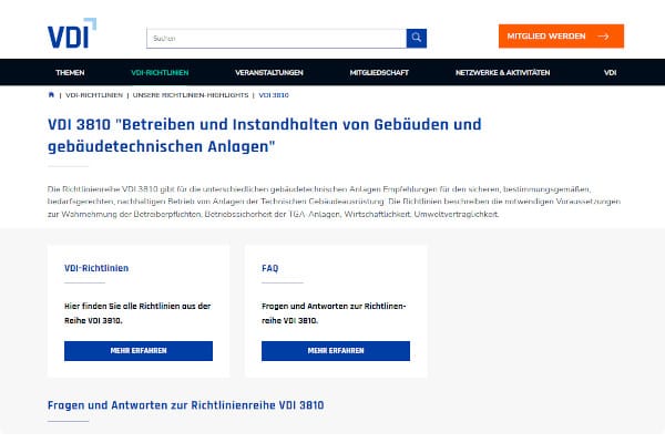 Die VDI-Richtlinien-Reihe VDI 3810 gibt für unterschiedliche gebäudetechnische Anlagen der technischen Gebäudeausrüstung (TGA) Empfehlungen für den sicheren, bestimmungsgemäßen, bedarfsgerechten, nachhaltigen Betrieb. Gebäudebetreiber sind in der Pflicht, die spezifischen Gefährdungen an ihrem Objekt zu kennen und dafür zu sorgen, dass diese Gefährdungen mindestens entsprechend dem Stand der allgemein anerkannten Regeln der Technik abgesichert werden.