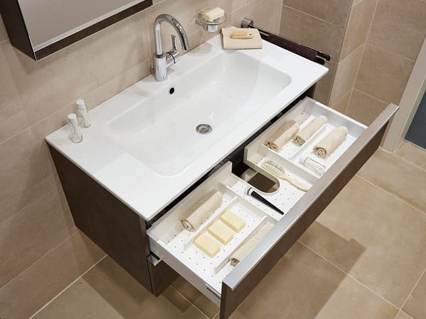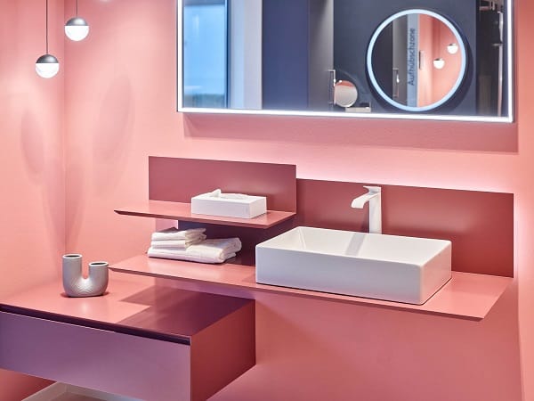 Ob Einbau- oder Aufsatzwaschbecken in allen möglichen Formen und Größen: der dazugehörige Unterschrank darf einiges können. Clevere Möglichkeiten zum Verstauen sind gefragt, erst recht beim Kleinstinterieur sind gute Lösungen für Kosmetik und Utensilien gefragt. Auf optimale Schubladeneinteilung und Schütten, Details wie eingebaute Steckdosenleisten, ein Magnet für das Nagelnecessaire und die Halterung für den Föhn wird Wert gelegt. Zu den Neuheiten gehören auch USB-Ladestation für das Smartphone inklusive Lautsprecher im Spiegelschrank. Dauerthema ist und bleibt der Spiegelschrank und mit ihm die Beleuchtung. Heß erläutert: „Das passende Licht ist nicht nur für die Damen beim Schminken relevant, sondern auch für die Herren beim Rasieren. Lichtspiegel sind ein sehr wichtiges Element in der Möbelanlage, die Beleuchtung ohnehin trägt wesentlich zum Wohlfühlambiente bei.“