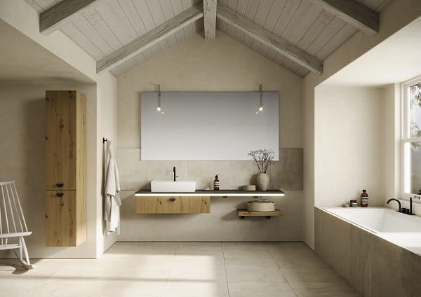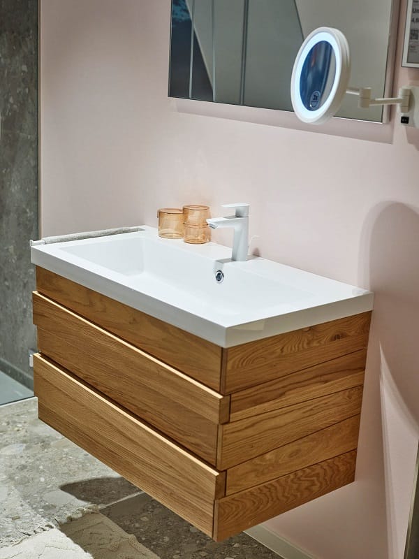 Seitdem ist viel passiert, sowohl in der Formensprache und dem Design als auch in der Farbgebung und in Sachen Materialien. Wo früher noch die Badmöbel in einem ganzen Block eingebaut wurden, stehen heute eher Einzelstücke im Vordergrund – auch an der Wand hängend. Beim Material hat sich vieles getan – beispielsweise sind momentan grafische Fronten und Rillenstrukturen immer häufiger zu sehen. „Die Verwendung von Echthölzern und Naturmaterialien ist aktuell sehr im Trend. Diese sind feuchtigkeitsresistent und speziell für die Ansprüche im Badezimmer hergestellt, brauchen dennoch eine bewusstere Pflege. Ob sich für einen Nutzer daher eher ein widerstandsfähiger Stein oder Keramik als Ablage oder andere Oberflächen besser eignen, finden wir im Gespräch heraus“, weiß Heß. Viele Materialtrends kommen auch aus dem Küchenbau, beispielsweise Antifingerprint-Fronten und praktische Auszüge, wo früher eher Türen zu finden waren. Was Vorlieben – nicht nur in Hinblick auf Optik, sondern auch in Bezug auf Reinigung und Pflege – anbelangt, werden die Gepflogenheiten der Käufer bei der Beratung besprochen und bei der Planung berücksichtigt.