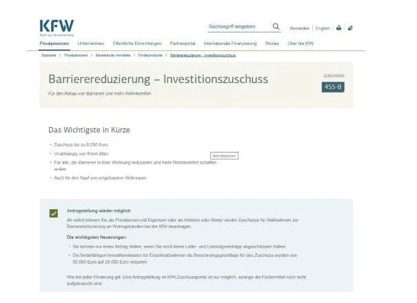 Die Zuschüsse für altersgerechten Umbau in Bestandsimmobilien können ab sofort wieder bei der KfW beantragt werden. Wer entsprechende Sanierungs- oder Umbaupläne hat, sollte diese zügig angehen. Denn wie bei jeder Förderung gilt: Eine Antragstellung im KfW-Zuschussportal ist nur möglich, solange die Fördermittel noch nicht aufgebraucht sind.