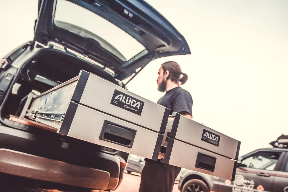Auf der robusten Deckplatte der dimension2 Schubladen finden weitere Aufbauten ihren Platz. Dank zahlreicher Zurrschienen, Spanngurte, einem Ladungssicherungsnetz und Aluca-Boxxen-System lässt sich das Beladungskonzept individuell während der Tour verändern und anpassen. Ersatzteile, Reifen, Spezialwerkzeuge, Bergematerial, Notfall- oder Erste Hilfe Equipment – alles kann bei Bedarf flexibel verstaut werden. In einem kleineren Schubladenblock finden z.B. Bremsbeläge, Filter, Luftfilter, Leuchtmittel oder Ersatzspiegel ihren sicheren Platz.