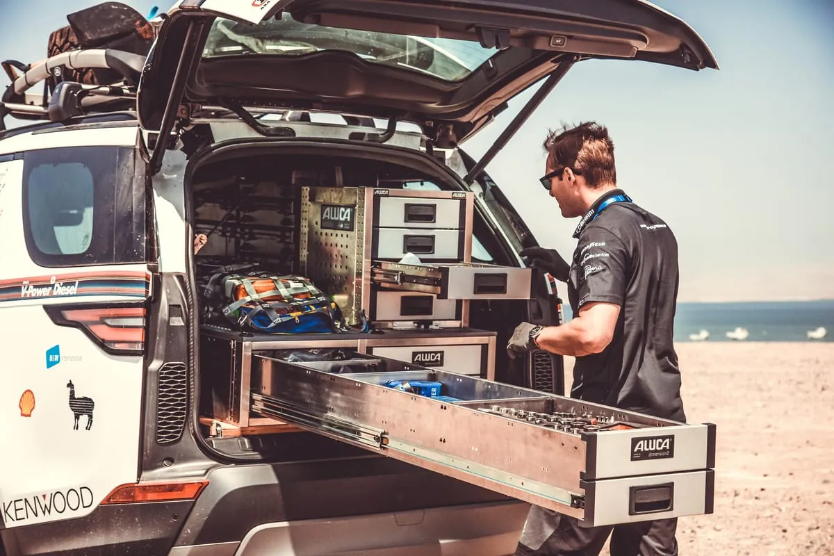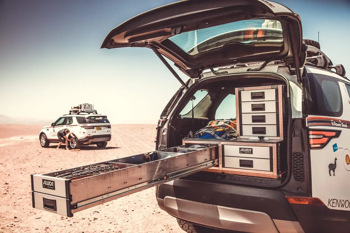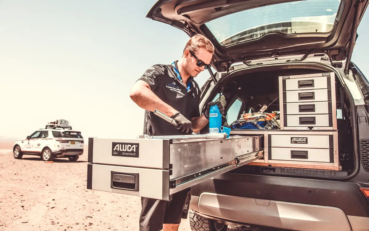 Die XXL-Schubladen sind die längsten, die Aluca zu bieten hat Diese Schubladen füllen exakt den Raum zwischen Heckklappe und erster Sitzreihe aus und gewähren Zugriff auf alle Werkzeuge und Ersatzteile. Fahrzeug und Einrichtung auf den bevorstehenden 3.200 km der Tour extremen Belastungen ausgesetzt. Gut 75 % der Tour finden offroad statt – es geht durch Wüste, Dünen, über enge Bergstraßen mit Matsch oder Geröll, über Urwaldwege oder quer durch Flüsse hinauf bis auf 4.720m hohe Bergpässe.