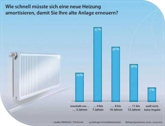 Das Marktforschungsunternehmen TNS Emnid hat für Primagas eine Umfrage durchgeführt. Die Frage war: „Wie schnell müsste sich eine neue Heizung amortisieren, damit Sie Ihre Anlage erneuern?“.
