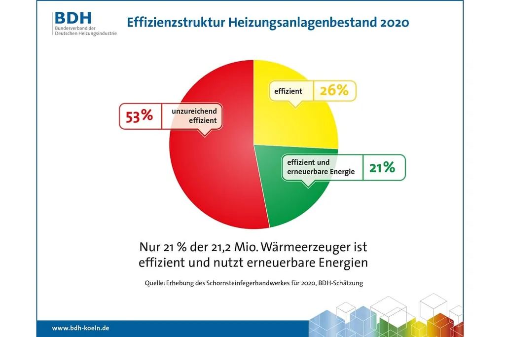 53 % der insgesamt rund 21 Millionen in Deutschland installierten Heizungen sind technisch veraltet und unzureichend effizient. Zu diesem Ergebnis kommt der Bundesverband der Deutschen Heizungsindustrie (BDH) nach Auswertung der Erhebungen des Bundesverbandes des Schornsteinfegerhandwerks (ZIV).