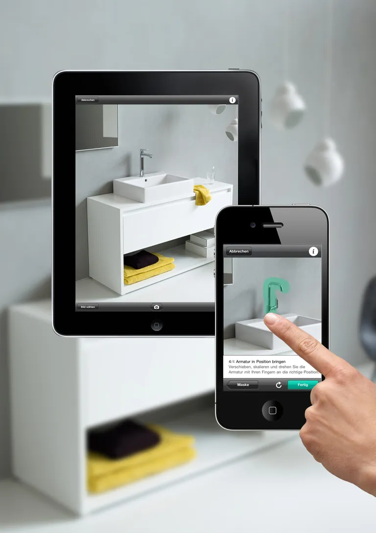 Die Hansgrohe@home 4.0 App ermöglicht es, verschiedene Armaturen für Bad und Küche sowie Duschlösungen in ein Foto einer vorhandenen Küchen- oder Badsituation virtuell einzubauen.