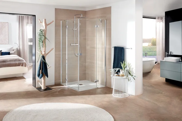 Zum einen gibt es keine zersprungenen Fliesen mehr, auch Probleme mit versteckten Leitungen, Untergründen mit wenig Halt für einen Dübel oder mangelnde Dichtheit an den Montagepunkten gehören damit der Vergangenheit an. Messfehler können kurzzeitig korrigiert werden und der Werkzeugbedarf wird reduziert. Zusätzlich spart die Montage ohne Bohren Zeit – vor allem wenn der Duschplatz mit Feinsteinzeug gefliest ist. Und die Baustelle bleibt sauber, da die Bohrlöcher entfallen.