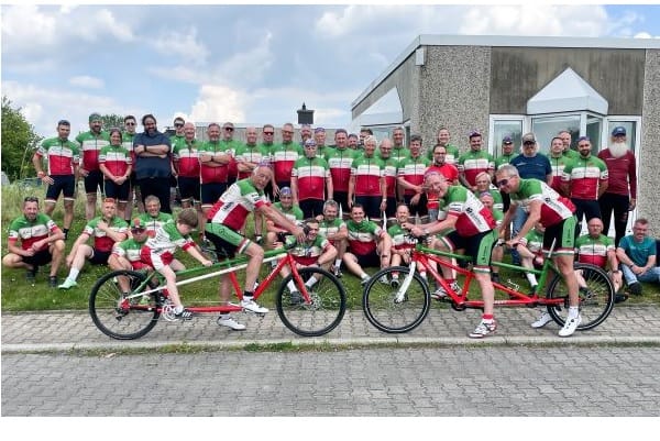 Das Team der Glückstour vor dem Innungsgebäude der Schornsteinfeger in Iserlohn zusammen mit einem besonderen und stolzen Gastradler. – © Glückstour e. V., Schloß Holte-Stukenbrock