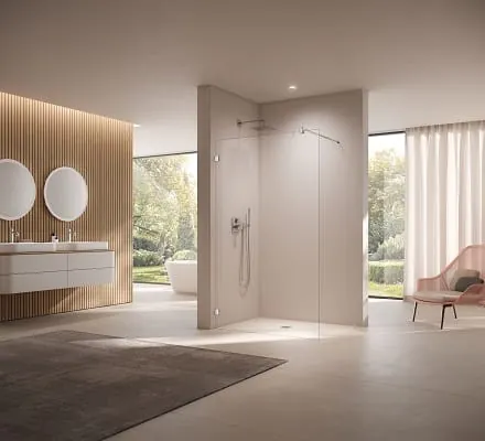 Die Integration in die bestehende Bausubstanz ist auch Leitgedanke bei vielen modernen Duschabtrennungen. Bei einer komplett rahmenlosen Konstruktion kommen die hochwertigen Metallbeschläge der Beschlag-Duschkabine „Mena“ von Kermi besonders gut zur Geltung. Aber auch dank des dezenten Wandprofils wirkt die Dusche sehr transparent. Alle Türen verfügen über einen nach innen und außen öffnenden Pendeltür-Komfort mit Hebe-Senk-Funktion und einen ungehinderten, bodenebenen Einstieg in die Duschkabine.