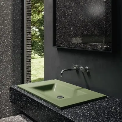 Aus Steinharz gefertigt: Das Gesteinspulver, das mit Kunstharz (Polyester) verfestigt wird, ist die Fertigungsgrundlage der Duschfläche „Olona“ von Geberit. – © burgbad
