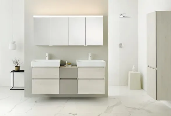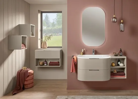 Beim neuen Systemprogramms „4balance“ von Sanipa sind Ruhe und Ausgewogenheit die Grundmerkmale: Das Design der Möbel und der Waschtische ist reduziert auf geometrische Grundformen bestehend aus Oval, Kreis und Quader. Der ovale Waschplatz, rechteckige Stauraummöbel und runde Formen im Spiegel lassen sich auf vielfältige Weise spielerisch miteinander kombinieren. Kernstück der Kollektion ist der Waschplatz, an dem Unterschrank und Waschtisch mit ihren konsequent ovalen Formen eine harmonische Einheit bilden. Der 80 cm breite Unterschrank bietet jede Menge praktischen Stauraum für die täglichen Badutensilien. Dank integriertem Anti-Rutsch-Boden lässt sich alles sicher und ordentlich verstauen. Wer mehr Platz benötigt, ergänzt ihn um die zurückversetzten Anbauschränke der Serie, die eine gute Raumökonomie bieten.