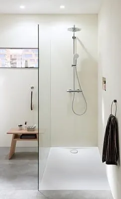 Die bodenebene Dusche steht beispielhaft für eine neue Generation von Ausstattungsprodukten als integraler Bestandteil und gleichzeitig architektonischen Gestaltungselement des Bades. Hinter vielen schlichten Schönheiten steckt viel Entwicklungsarbeit und Fertigungs-Know-how: Noch in den 1970er-Jahren waren Duschwannen bis zu 30 cm hohe Aufbauten.