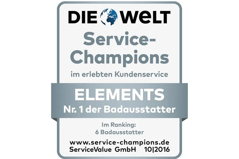 Elements ist die Nummer 1 unter den Badausstattern – das ergab ein Service-Ranking, das in Kooperation mit der Analyse- und Beratungsgesellschaft Service-Value, der Goethe-Universität Frankfurt am Main und der Tageszeitung Die Welt erstellt wurde.