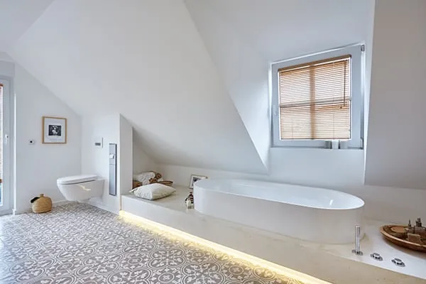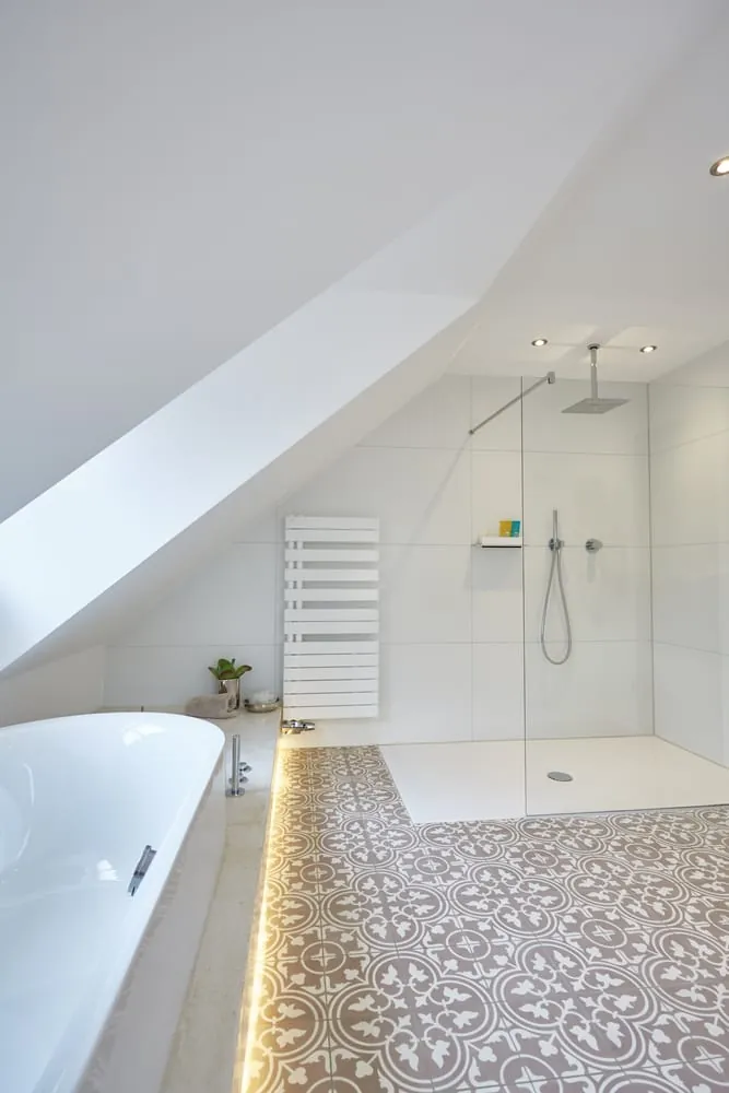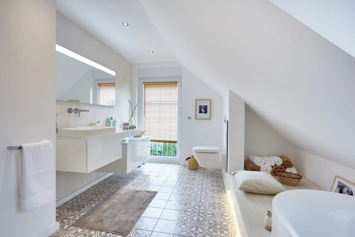 Ein großzügiges Badezimmer mit bodenebener Dusche und Wanne, ein lichtdurchflutetes Schlafzimmer und ein praktischer Arbeitsplatz – das Ehepaar Belfqih hat sich seinen persönlichen Wohntraum durch eine Sanierung erfüllt.