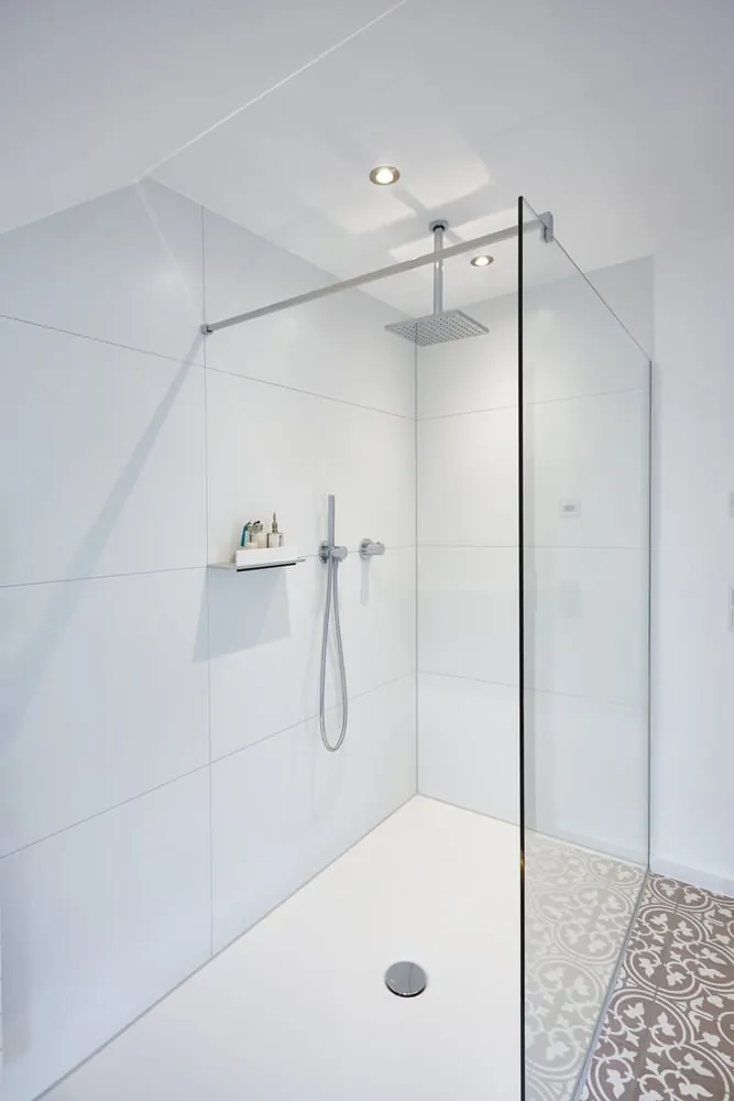 Die große bodenebene Dusche wird mit einer gläsernen Duschwand abgetrennt und gibt dem Raum zusätzliche Tiefe. Minimalistisch und designstark zugleich plante Bettina Bickert hier mit Ixmo Armaturen „Ixmo passt hervorragend zu der Badgestaltung der Belfqihs, weil es die Leichtigkeit ungewöhnlich konsequent umsetzt. Nicht nur in der Formgebung, sondern auch dadurch, dass man die Zahl der Module auf ein Minimum reduzieren kann“, sagt die Planerin. Die clevere Bündelung von Funktionen ermöglicht die Reduktion der Armaturen auf der Wand. Egal ob rund oder eckig: Die Rosetten haben konsequent eine Seitenlänge bzw. einen Durchmesser von 90 mm und die Ausladung beträgt immer 80 mm. Ixmo Armaturen sind Multitalente im minimalistischem Design. Für die Duschanwendung werden für Kopf- und Handbrause nur zwei Ixmo Armaturenmodule benötigt.