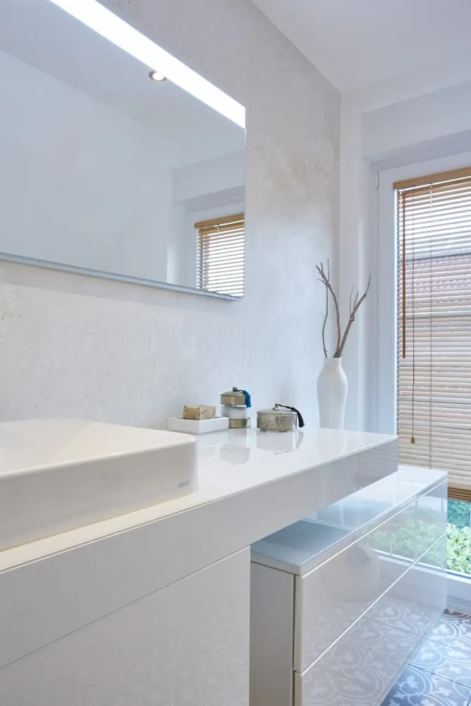 Zuletzt wurde das Badezimmer der Familie vor ca. 20 Jahren saniert. Die Einrichtung aus den 90er-Jahren musste zeitgemäßem Interieur weichen. Zu den verputzten sandfarbenen Wänden wählte Bettina Bickert einen Keramik-Waschtisch und weiße, hochglänzende Badmöbel aus der Edition 400 von Keuco, die für reichlich Stauraum sorgen, mit passenden verchromten Armaturen und Accessoires. Mit einer auffallend eleganten Schlankheit und umlaufendem Aluminiumrahmen zeigt sich der Lichtspiegel der Edition 400 über dem Waschplatz.