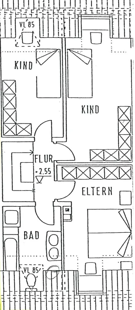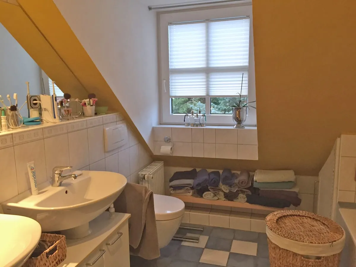 Dafür wurden Zimmer zusammengelegt und die Etage neu strukturiert: Die beiden Kinderzimmer bilden nun den Schlafbereich mit einem begehbaren Kleiderschrank. Das einstige Elternschlafzimmer und das Bad wurden zu einem Raum zusammengefasst. Heute ist hier das neue, großzügige Badezimmer zu finden. Ein Arbeitsplatz befindet sich im Flur zwischen den Zimmern.
