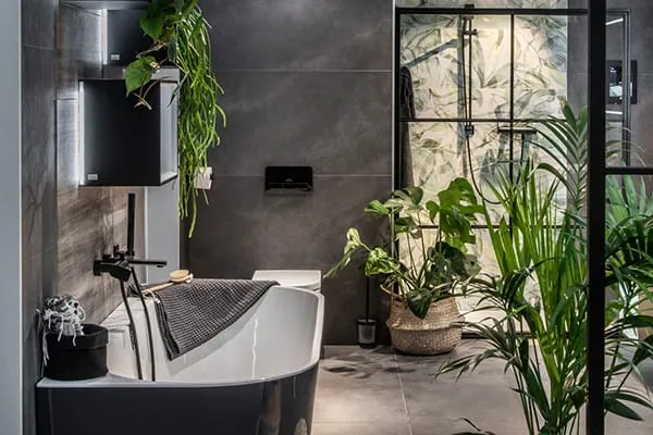 Dass die Natur nicht nur für Ruhe und Ausgeglichenheit stehen muss, beweist der Trend Urban Jungle. Hier darf die Natur ihre wilde Seite zeigen. Umgesetzt wird der Trend mit expressiven Tapeten im Dschungel-Look oder exotischen Zimmerpflanzen – beides im Badezimmer längst kein Tabu mehr! Dazu passen Möbel in Holz- oder Erdtönen und klassisch weiße Keramik. Auch starke Kontraste sind erlaubt: In Farbe oder coolem Black and White-Look. Der perfekte Naturtrend für Abenteurer!