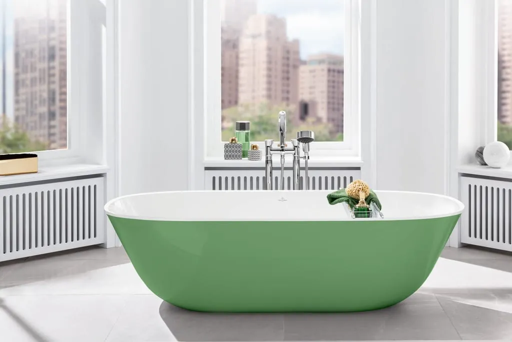 Mit einer farbigen Schürze in persönlichen Lieblings-Grün wird aus der Badewanne eine regelrechte Wellness-Lagune. Ein Artis-Waschtisch in der Trendfarbe Neo-Mint wiederum schlägt eine Brücke zwischen Natur und Zivilisation: Kein anderer Grünton spielt in einer hochtechnisierten Welt so gekonnt mit unserer Sehnsucht nach Ursprünglichkeit.