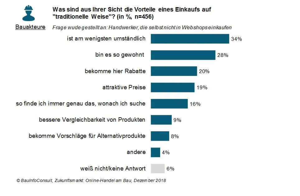 Dennoch sollten sich die traditionellen Vertriebler nicht zu sehr auf ihren Lorbeeren ausruhen: Auf genauere Nachfrage nach den konkreten Vorteilen des Einkaufs per Telefon oder in der Fachhandelsfiliale gaben sich die Branchenakteure nämlich vor allem pragmatisch: Einkaufen auf traditionelle Art hat für die Webshop-Muffel unter den Handwerkern den Vorzug der Gewohnheit (28 %), sodass der Einkauf als wenig umständlich erlebt werden kann (34 %). An dritter Stelle stehen schon Preisvorteile und Rabatte (20 %).