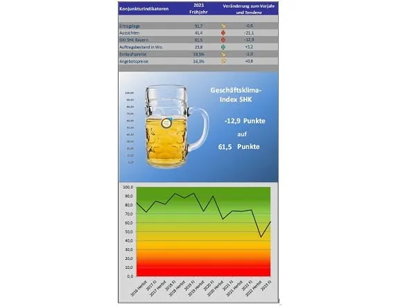 Der SHK-Geschäftsklimaindex für die bayerische SHK-Branche wird vom Fachverband SHK Bayern basierend auf der eigenen Konjunkturumfrage alle sechs Monate ermittelt. Der aktuelle Wert nahm im Frühjahr 2023 um 12,9 Punkte gegenüber seinem Stand vom Vorjahr auf insgesamt rund 61,5 Punkte ab.