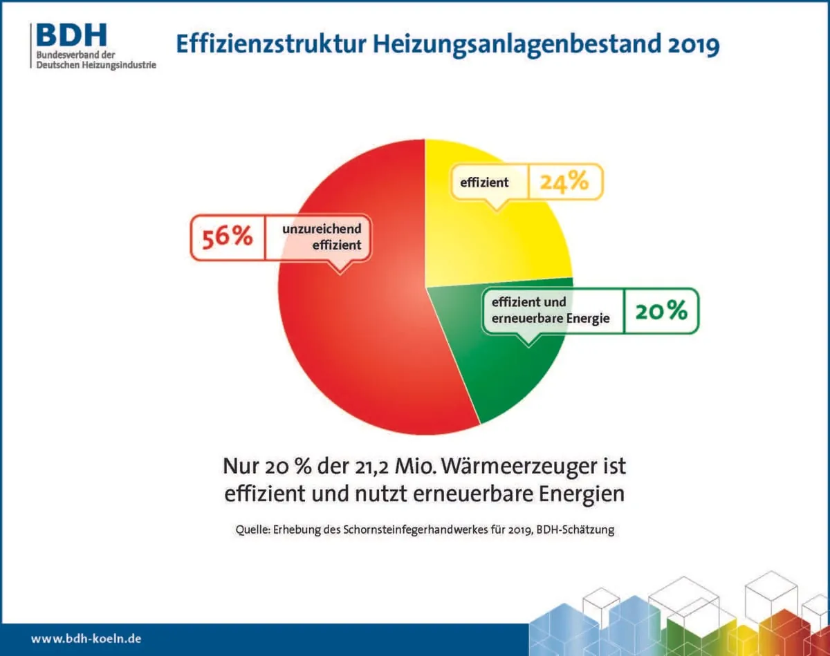 56 % der insgesamt ca. 21 Mio. in Deutschland installierten Heizungen sind technisch veraltet und damit unzureichend effizient. Das ist das zentrale Ergebnis der Erhebungen, die der Bundesverband des Schornsteinfegerhandwerks (ZIV) und der Bundesverband der Deutschen Heizungsindustrie (BDH) jährlich durchführen.