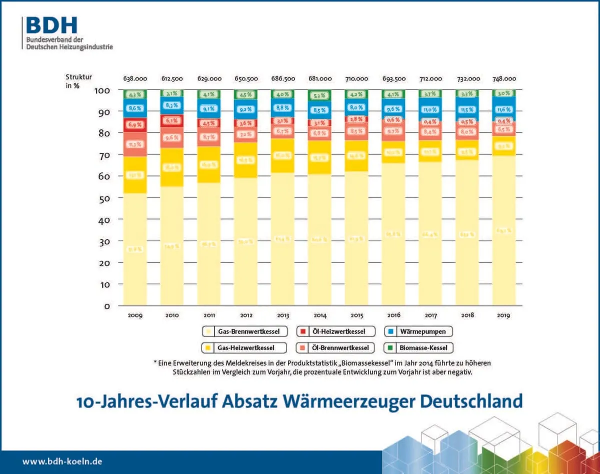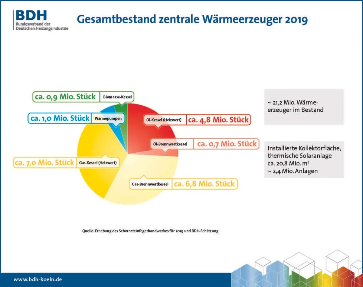 Dies trifft auf die rund 0,9 Mio. Biomassekessel, 1 Mio. Wärmepumpensowie 2,4 Mio. Brennwertgeräte in Kombination mit einersolarthermischen Anlage zu. „Der Blick auf den Anlagenbestand macht deutlich, dass die dringend benötigte Wärmewende noch in weiter Ferne liegt“, kommentiert BDH-Präsident Uwe Glock. „Im Sinne des Klimaschutzes und der Erreichung der Klimaziele müssen die enormen Potenziale des Wärmemarktes beschleunigt gehoben werden.“