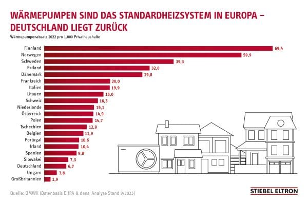 Stiebel Eltron beruft sich auf die Statistik der European Heat Pump Association (EHPA). In Finnland haben 69, in Norwegen rund 60 und in Schweden 39 von 1.000 Haushalten 2022 eine Wärmepumpe eingebaut. Die rote Laterne trägt Großbritannien (2 Einheiten), Vorletzter ist Ungarn (4 Einheiten), Drittletzter Deutschland (7 Einheiten).