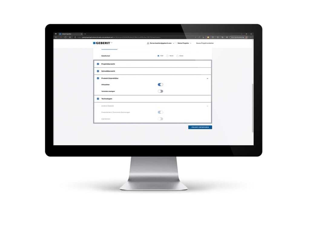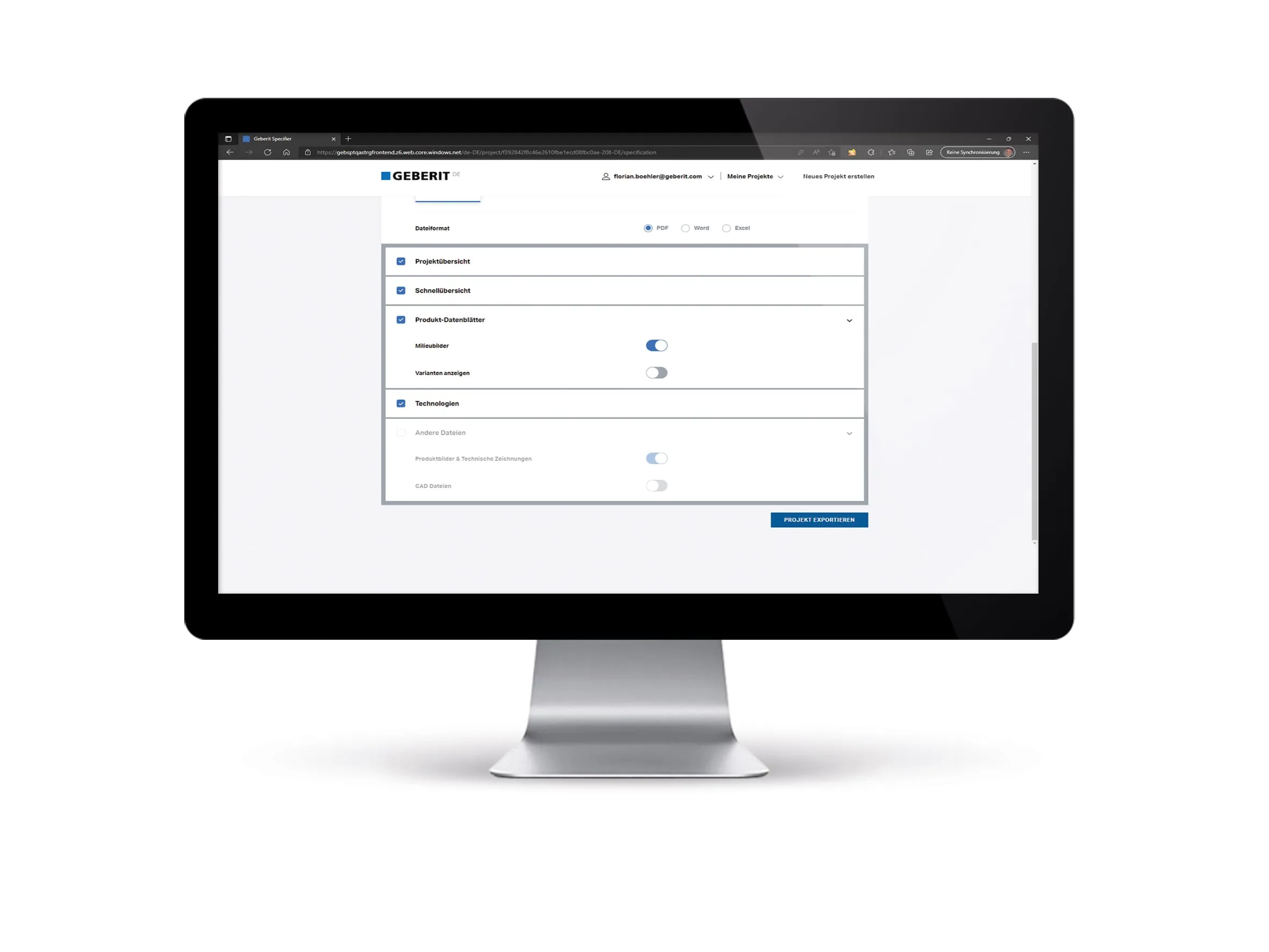 Nach der abgeschlossenen Planung für ein Objekt erfolgt der Export in verschiedene Formate: Als PDF-Datei, Word- oder Excel-Dokument. Die Dokumente beinhalten eine übersichtliche Liste der Produkte, Detailseiten zu den Produkten sowie die jeweiligen Datenblätter. Enthalten sind in den Dokumenten zusätzlich die exakten Produktdaten wie Größe und Artikelnummer sowie das entsprechende Bildmaterial und technische Zeichnungen.