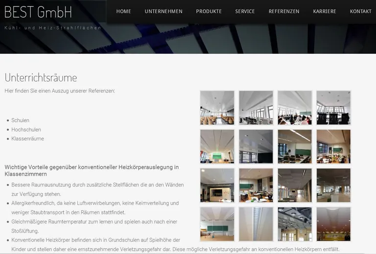 Im Abschnitt „Referenzen“ stellt Best eine breite Palette realisierter Projekten vor. Das reicht von Schulen, Sporthallen und Kindertagesstätten über Industrie, Verwaltung und Gesundheitsbauten bis zu Kirchen verschiedener Konfessionen.