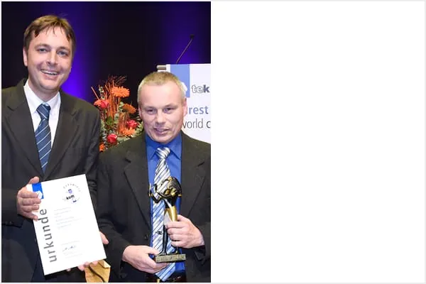 Die technischen Redakteure Thomas Scholz und Wolfgang Rösser von Bosch Thermotechnik bei der Preisverleihung im November in Stuttgart. – © Buderus