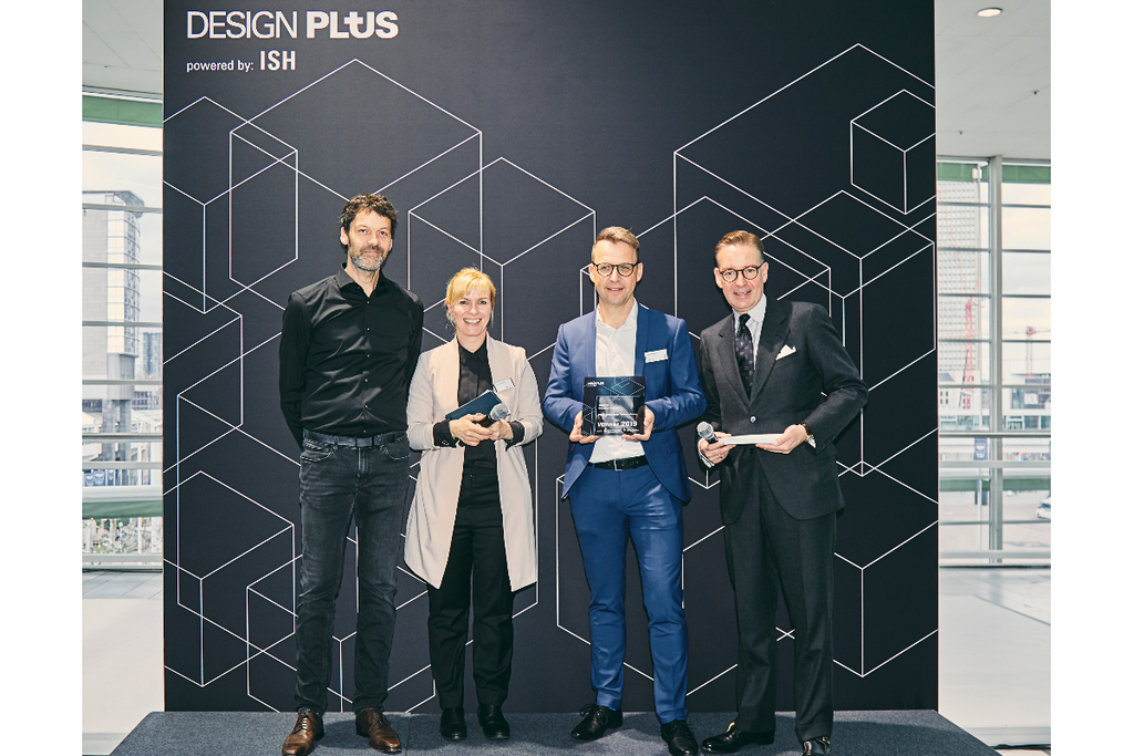 BetteCraft gewinnt gleich zwei Preise: (v.l.) Dominik Tesseraux (Tesseraux + Partner), Dominique Ewert (Leiterin Marketingkommunikation Messe Frankfurt), Sven Rensinghoff (Bette) und Andrej Kupetz (Rat für Formgebung) bei der Preisverleihung des Design Plus Awards auf der ISH. – © Rat für Formgebung/Foto: Christof Jakob