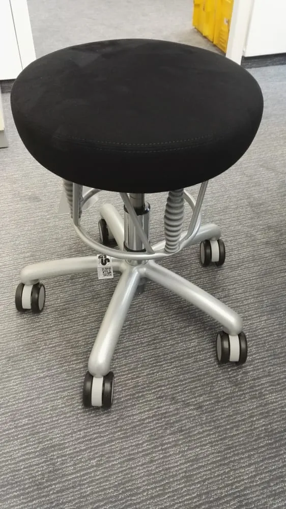 Design: Der Hocker ist schlicht gehalten. Das Sitzpolster mit einem Durchmesser von 37 cm aus schwarzem Mikrofaser-Bezug wird getragen von einem silbernen Gestell mit Fußkreuz. Das Fußkreuz nimmt eine Fläche von 49 cm ein, die schwarzen Rollen sind 6,5 cm groß. Rückenlehne und Armlehnen besitzt der Foxter nicht. Als Option für den Handwerker-Alltag gibt es einen Bezug aus robustem Kunstleder.